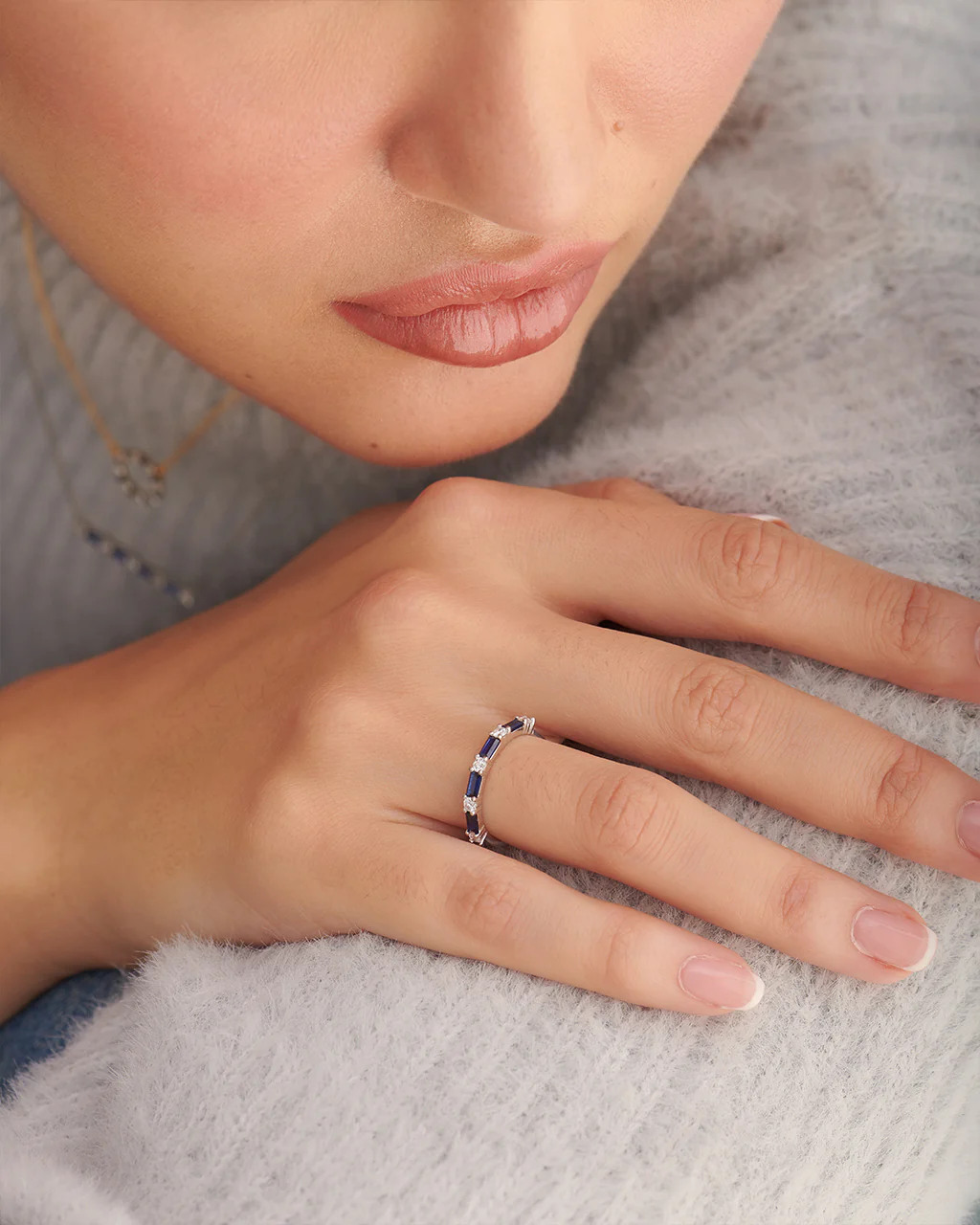This baguette and diamond band is perfect for the girl who loves modern and stylish jewelry. The combination of baguette and round diamonds creates a unique texture and shine, making it a standout accessory.