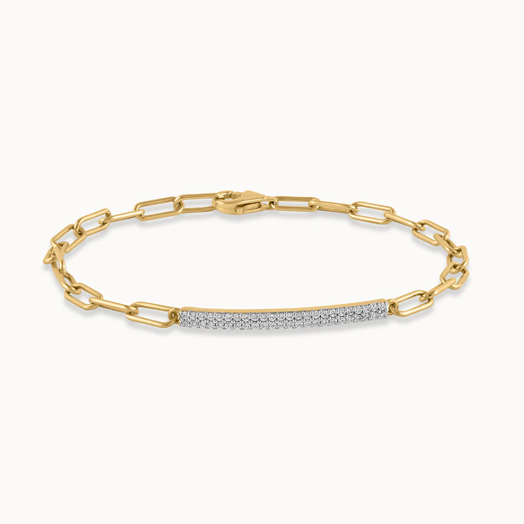 Our Bar Diamond Paperclip Bracelet brings together sleek design and sparkling detail. This 14K Vermeil Gold bracelet features a bar motif set with pave lab-grown diamonds, seamlessly integrated into the paperclip-inspired links. The combination of geometric shapes and brilliant diamonds creates a contemporary piece that adds a touch of elegance to any outfit.