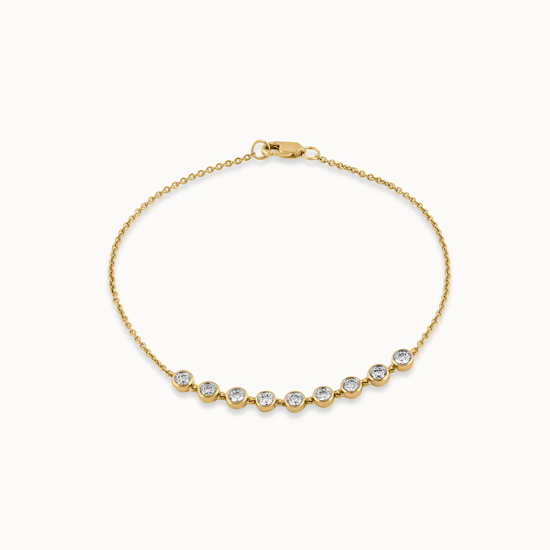 The Bezel Set Chain Bracelet is a sleek and modern accessory. This 14K Vermeil Gold bracelet features round lab-grown diamonds set in a bezel setting, linked together to form a delicate chain. The secure bezel setting and minimalist design make this bracelet a refined and stylish choice for everyday wear.