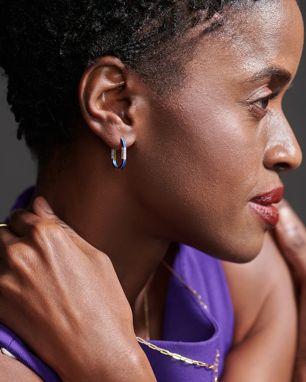 These Blue Cera Ovate Diamond Hoops add a pop of color to your look. The unique blue ceramic material and sleek design make these hoops modern and chic.