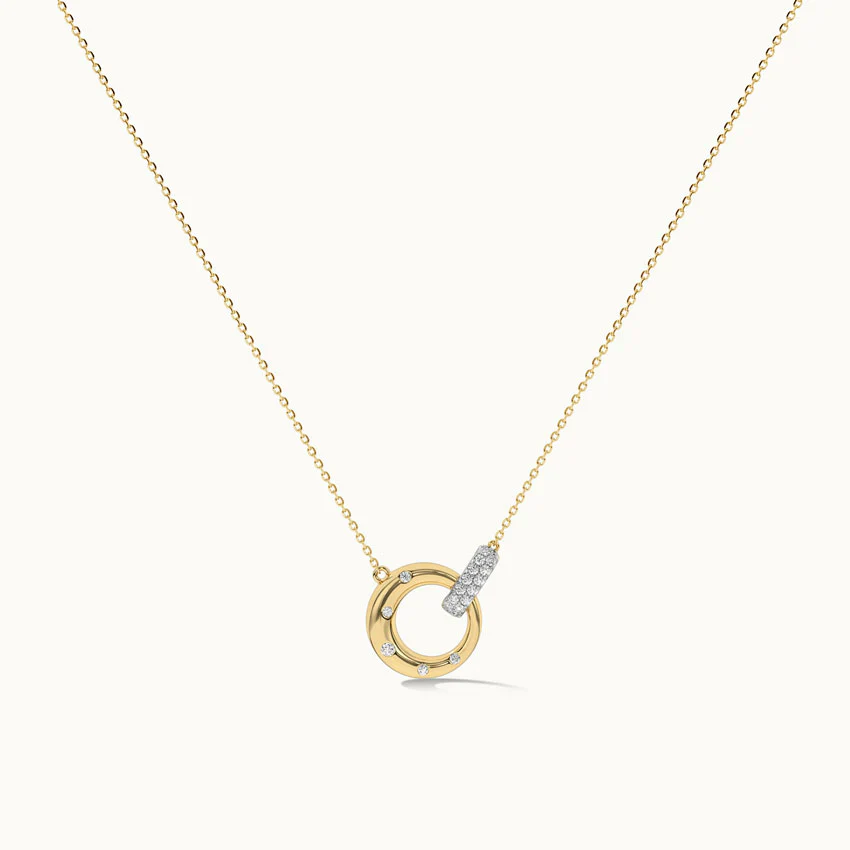 Add a touch of uniqueness to your style with this Interlocking Diamond Necklace. The interlocking design, adorned with diamonds, creates a captivating and stylish accessory.