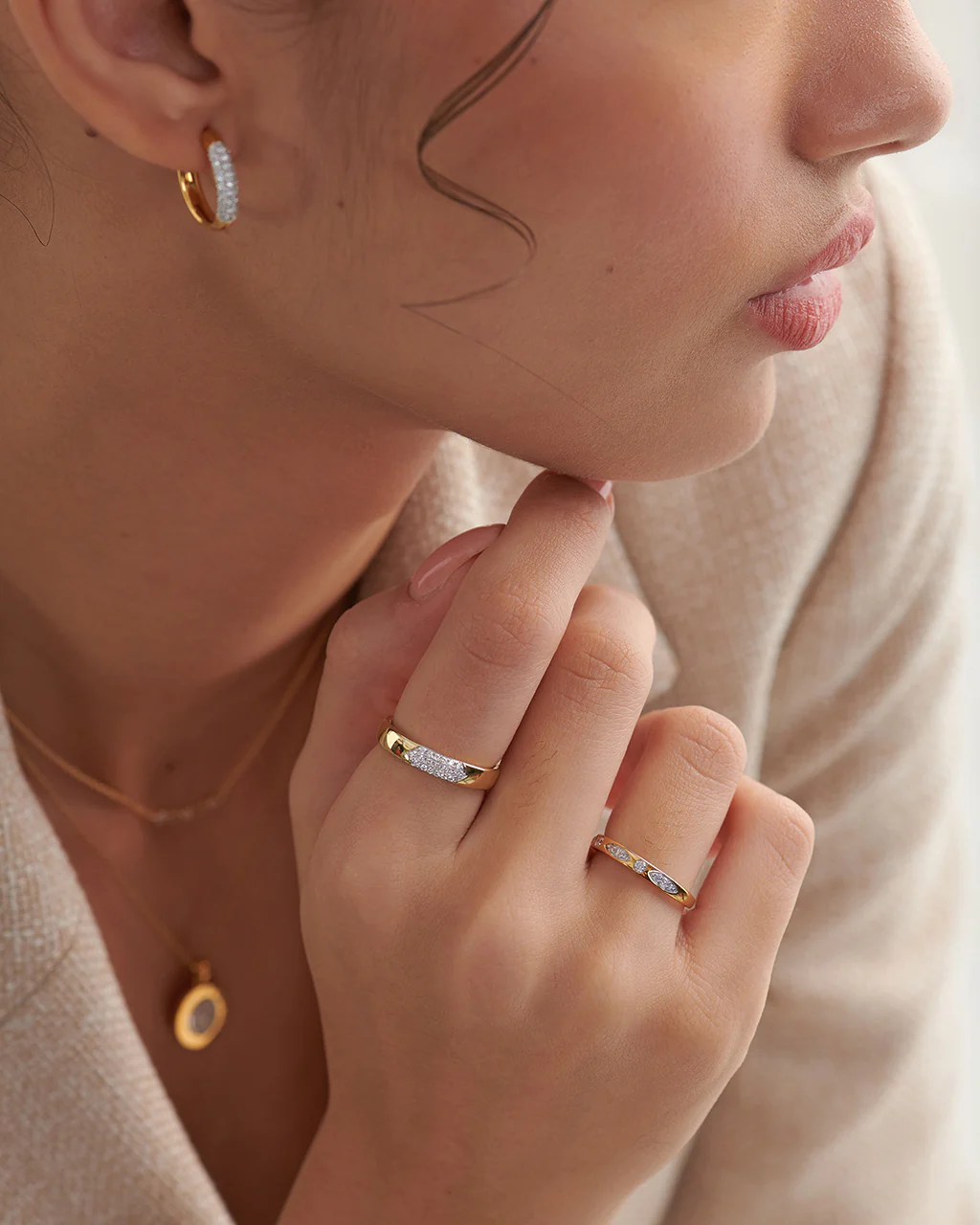 Make a bold statement with the Three Row Diamond Band. This captivating ring features three rows of sparkling diamonds set in a sleek and modern design, creating a glamorous and eye-catching look. It's the perfect accessory to express your confident and stylish personality.