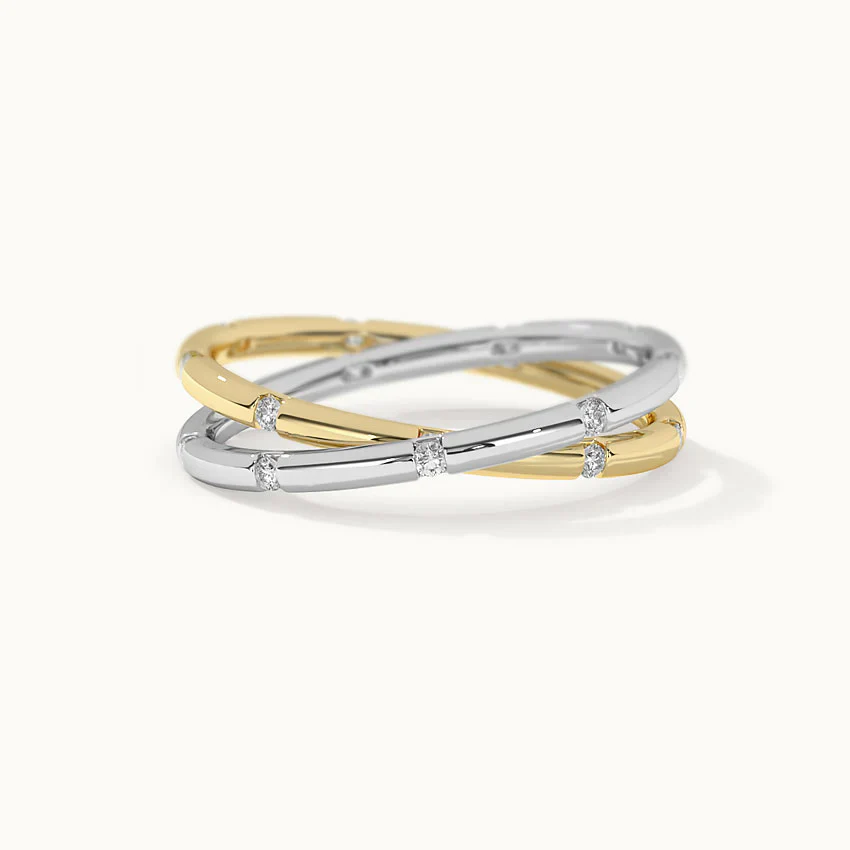 Add a touch of versatility and contrast to your ring collection with the Two Tone Interlocking Diamond Band. This striking ring features interlocking bands in two different tones, with sparkling diamonds accentuating the design.